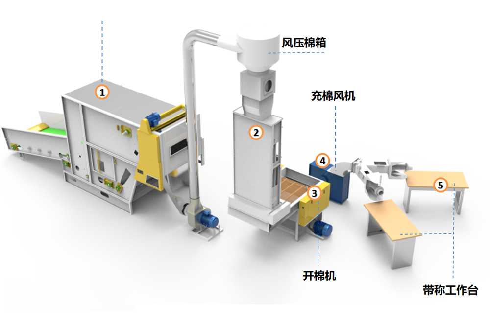①該生產(chǎn)線主要用于將滌綸短纖維原料開松并定量填充到枕頭、抱枕、沙發(fā)坐墊中。
