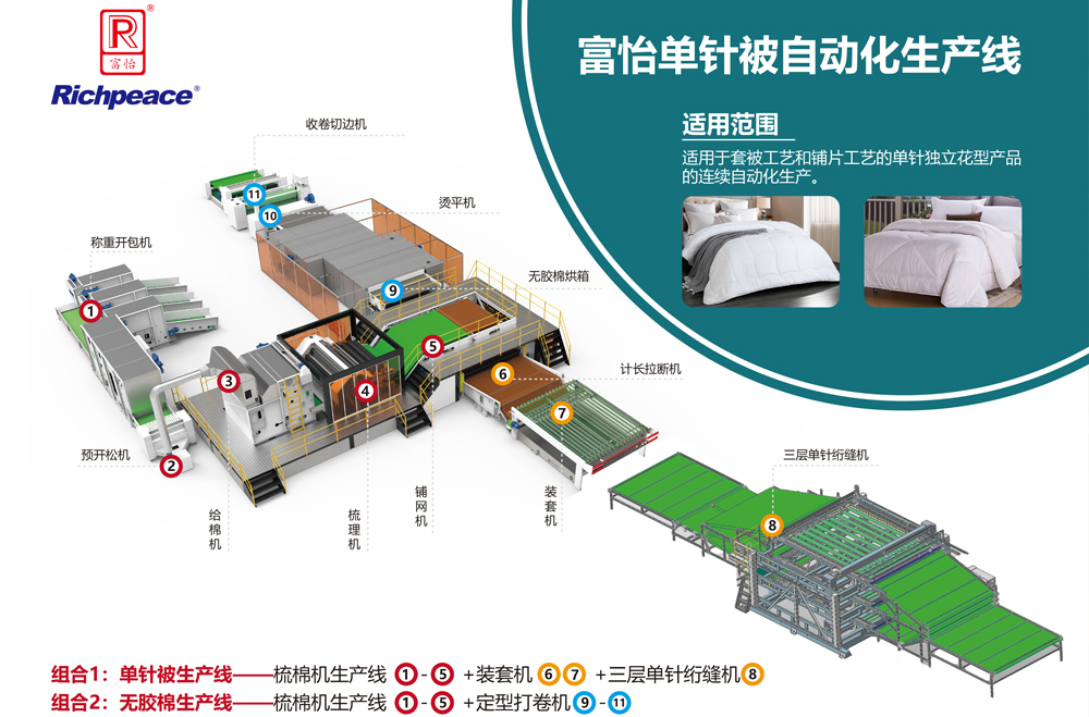 組合1:?jiǎn)吾槺簧a(chǎn)線——梳棉機(jī)生產(chǎn)線+裝套機(jī)+三層單針絎縫機(jī)